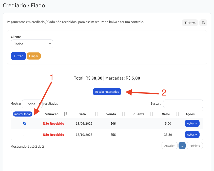 - Marque os pagamentos que deseja dar baixa. Marcar todos ou os que desejar. Mostramos o valor total das marcadas.