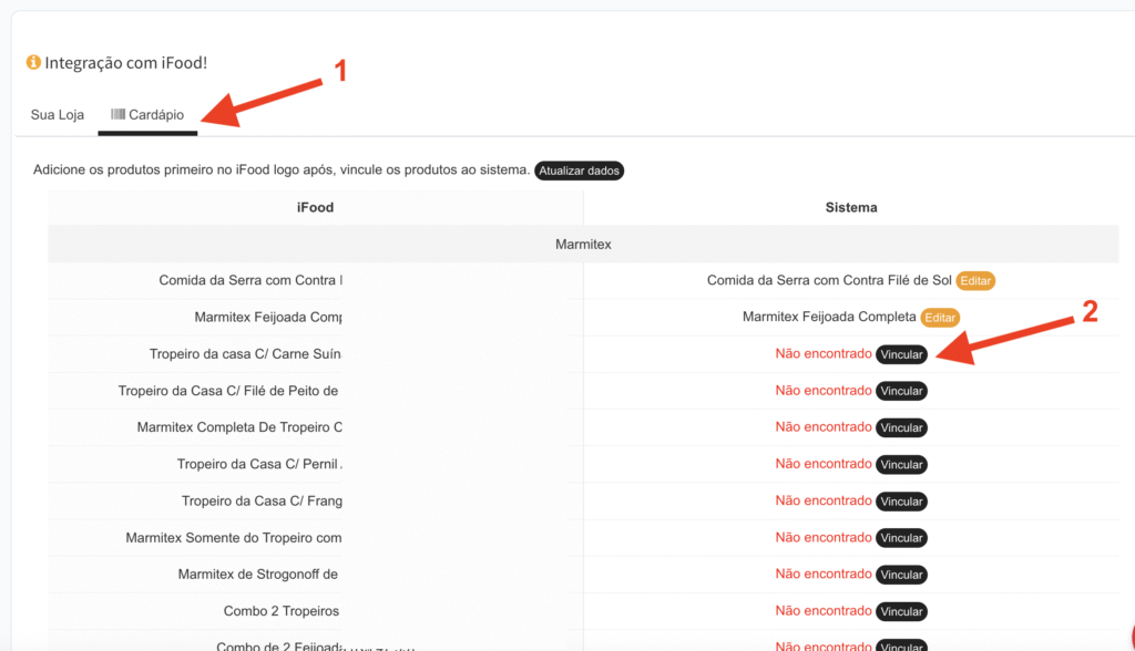 De um lado estará os produtos do ifood e no outro os produtos no sistema.