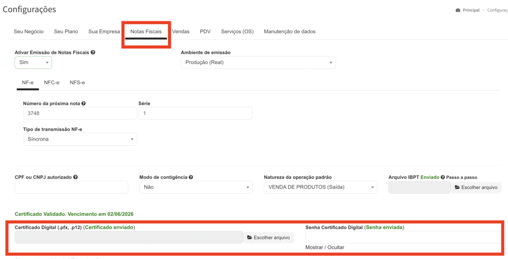 Clique na seção de Notas Fiscal (Deve estar Ativar a emissão de Notas Fiscais: Sim)